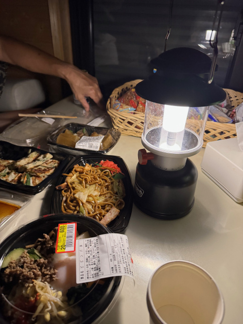 道中で総菜を買ってあったのと、山荘の設備としてランタンがあったので